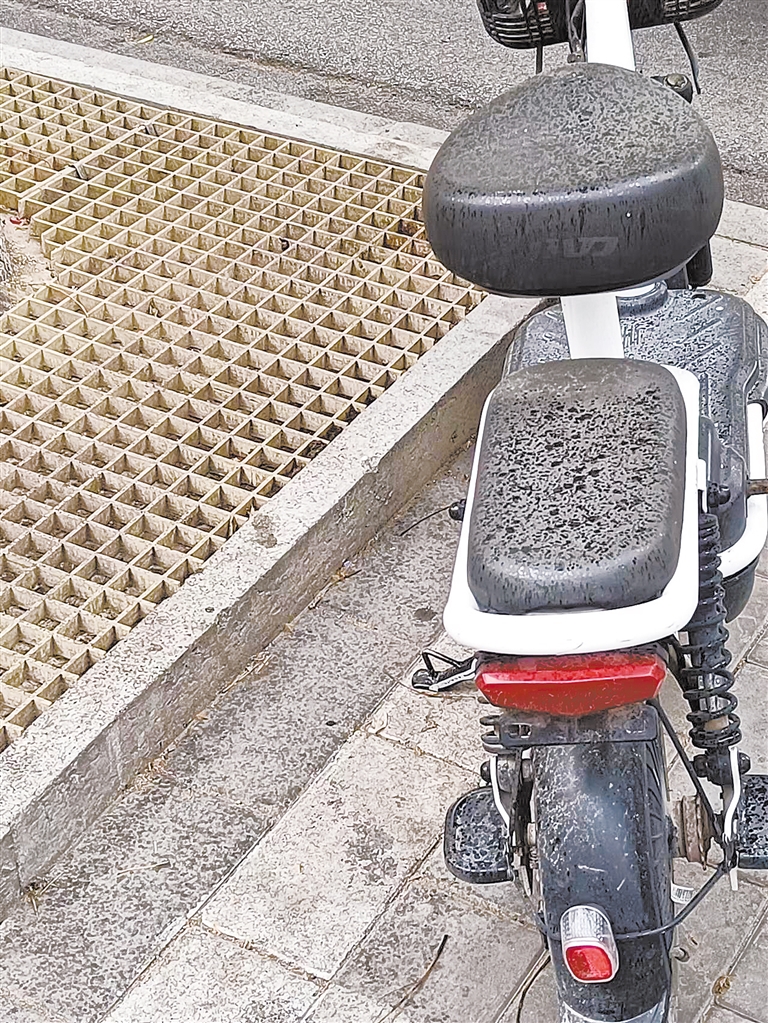 26日上午,記者來到此路段,行道樹生長得非常茂密,樹干上偶爾有些小蟲子。一位負責清掃此區(qū)域的環(huán)衛(wèi)工人告訴記者,這種紅色的小蟲并非所有行道樹都長,而且并不是時時都能看到,天氣熱的時候比較多。在道路兩側,記者觀察到有紅色小蟲正在樹干上爬,大部分已經(jīng)長出翅膀,落在樹葉上,一些樹葉還有被蟲咬過的痕跡。樹下的地面有明顯的黑色痕跡,踩上去還黏糊糊的。由于樹上會落下黏液,停放在附近的不少自行車座椅上套上了塑料袋。“天氣太熱,車子放樹蔭下還能防曬,為了防止黏液落在車座上面,只能套個塑料袋。”一位剛剛把電動車停好的市民說道。