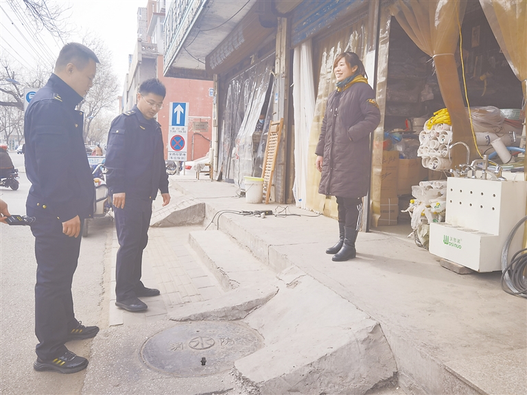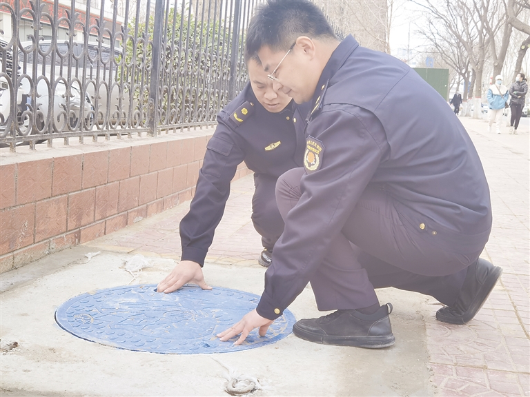 在永華南大街一處門臉外,何旭(中)帶領稽查隊查到一處井蓋凸起情況。