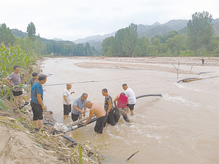 “一二,一二!”8月6日,在淶源縣南馬莊村,十幾名青壯年喊著號(hào)子,將車(chē)上的管道搬卸下來(lái),把150米的臨時(shí)管道從山上蓄水池越過(guò)南馬莊河一直鋪設(shè)到南馬莊村北岸。