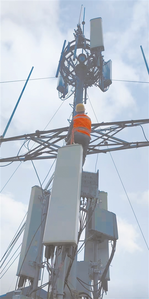 基站信號(hào)故障,電信工作人員上塔進(jìn)行設(shè)備修復(fù)。