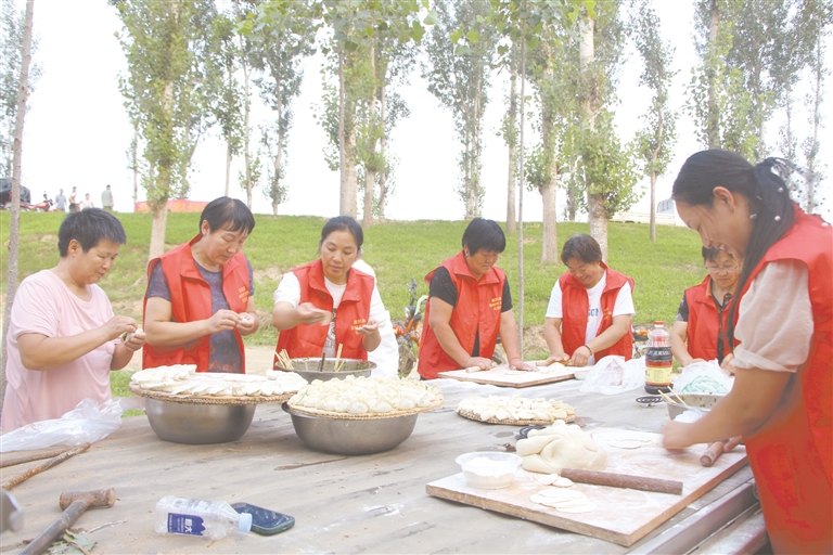 15時,人們在村委會集合,開始和面、切菜、拌餡,16時,她們帶上面、餡和搟面杖等來到河堤上,大家分工合作,搓面、揪劑子、搟皮、包餃子、燒水……大家忙而不亂,不一會就包出20多蓋簾餃子。