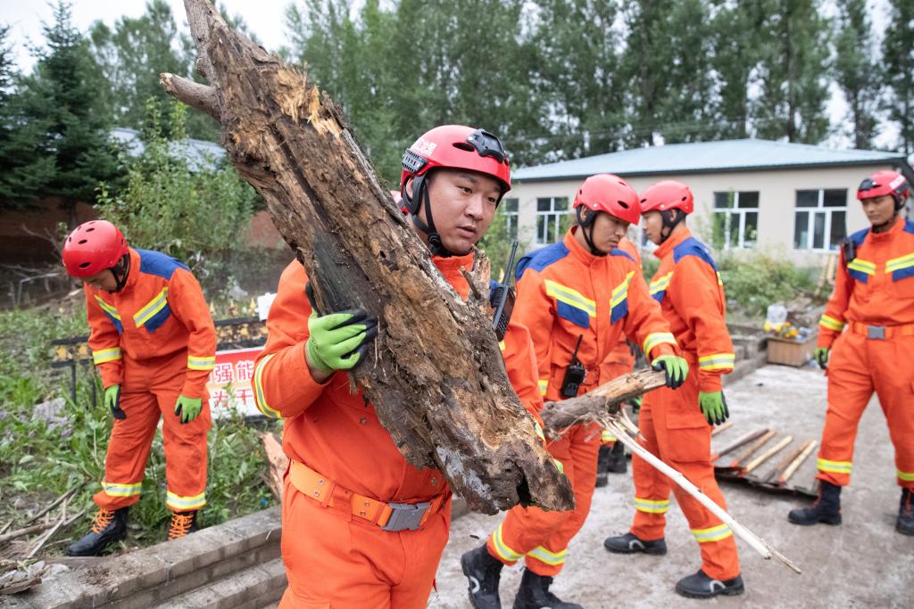 8月6日,在海林市長(zhǎng)汀鎮(zhèn)內(nèi),消防救援人員在清理院舍。新華社記者 張濤 攝