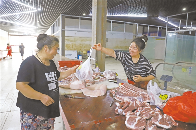 在生鮮賣(mài)場(chǎng),商戶(hù)崔艷波凌晨3時(shí)就到攤位忙碌起來(lái),她當(dāng)天購(gòu)進(jìn)了8頭排酸豬700余公斤肉,不到一上午,大部分豬肉都被老客戶(hù)買(mǎi)走,只剩下百余斤零售。