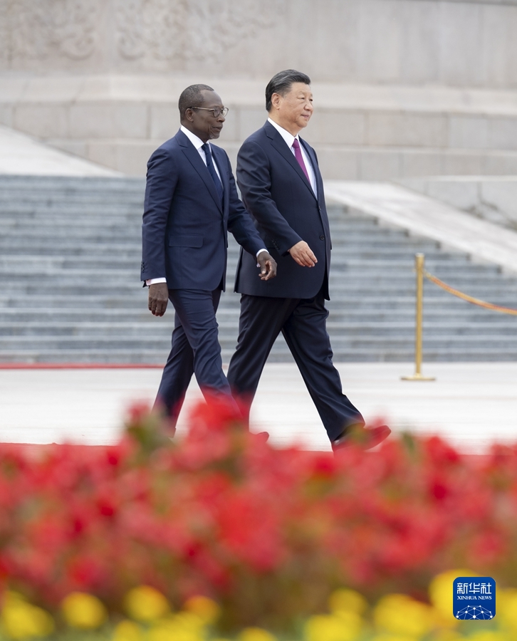 9月1日下午,國家主席習近平在北京人民大會堂同來華進行國事訪問的貝寧總統塔隆舉行會談。這是會談前,習近平在人民大會堂東門外廣場為塔隆舉行歡迎儀式。