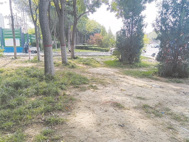一位路過的行人告訴記者,這片草坪被毀壞已將近兩個月,起初沒有這么嚴重,但隨著踩踏越多就越禿,慢慢就成了這個樣子?!霸狡茐脑絿乐?,大家看到地面沒草了,走的人就更多了。除了行人踩踏,還有賣小吃的在里邊經營,常常留下垃圾。有時候還有各種車輛停放在里邊。本來這條路上的草地都收拾得整齊漂亮,看起來很賞心悅目,現在這一塊草地太煞風景了。希望相關部門能修復一下,也呼吁大家能愛護草坪。”
