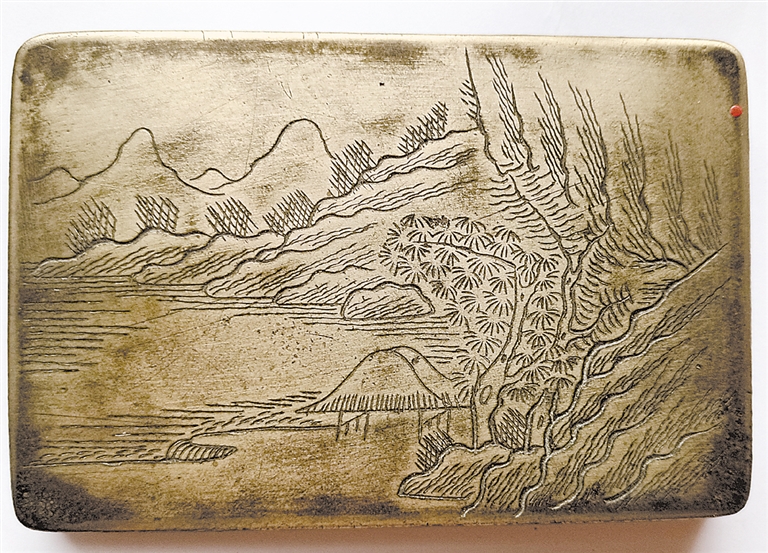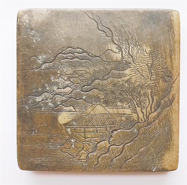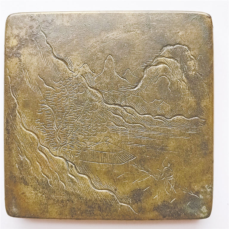 我收藏了幾方精刻山水圖案的銅墨盒,畫作具有清代山水畫風格,充滿了詩情畫意,令人心馳神往。觀賞墨盒,臥游山水,亦可飽覽如畫美景。