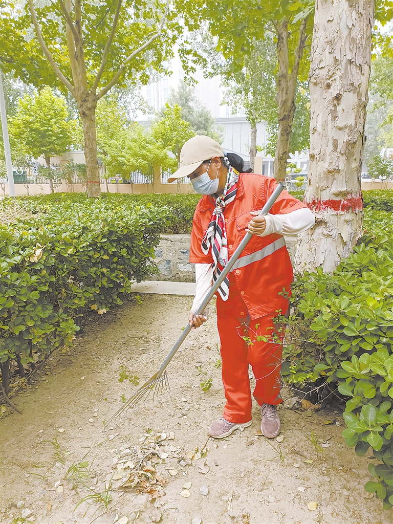 環衛人員使用竹耙子對綠化帶內的垃圾進行清掏。
