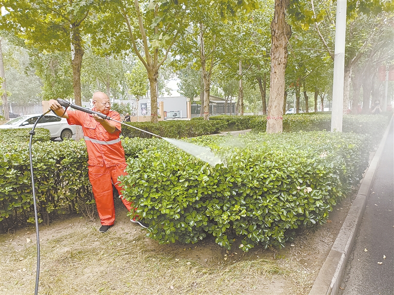 保定晚報訊(記者耿靜 通訊員井惠)“撿、掃、沖、洗”每個環節循序漸進,清掃機械與環衛工人全力配合,9月10日,在向陽北大街與魯崗路交叉口往北路段,環衛人員正在進行綠化帶集中清理。