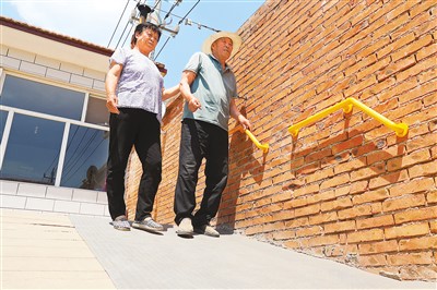 6月16日,河北省張家口市橋東區兩位老人在裝有扶手、防滑地膠的院內行走。岑 屹攝(人民視覺)