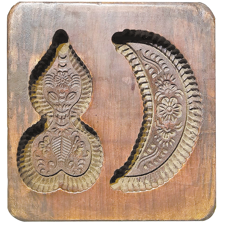模具背面開鑿了一個葫蘆形凹槽和一個月牙形凹槽,其規模比正面圖案要小,深均為2厘米。兩凹槽內雕刻有花朵、芭蕉葉等圖案,厚重古樸,栩栩如生。此模具雕工刀法細膩嫻熟,印紋凹凸有致,生動活潑,布局合理,尤其令人驚嘆的是,工匠在木料幾乎相同的位置上進行雙面雕刻又不使其穿透,且深度已達到了可雕刻的極限,可見工匠的雕刻技藝十分精湛。