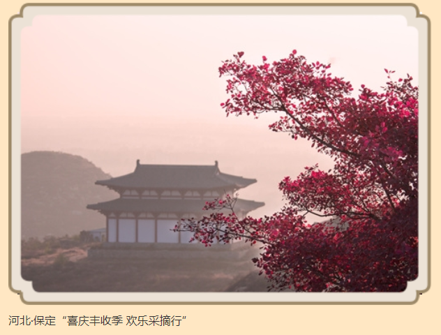 據(jù)悉,河北此次有5條線路入選,分別是:“樂享田園風光 暢游詩畫邯鄲”“新樂‘訪羲皇圣里 品甜蜜生活’鄉(xiāng)村游”“保定‘喜慶豐收季 歡樂采摘行’”“‘山海攬勝 果香盛競’之旅”“邢臺登山采摘鄉(xiāng)村休閑之旅”。