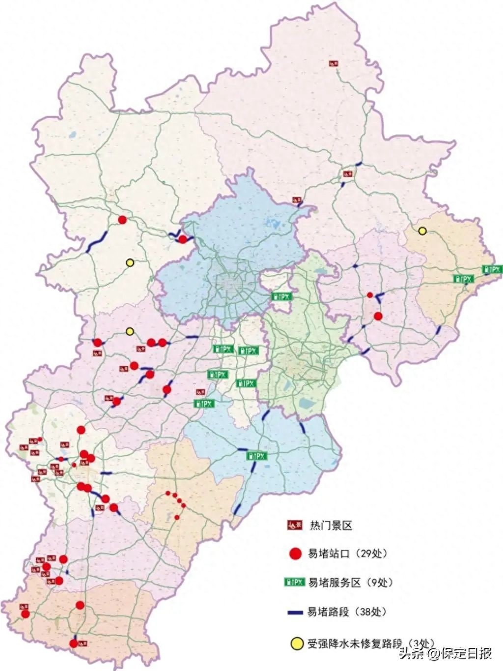 預判易堵路段38處,易堵站口29處,易堵服務區9處,受強降水未修復路段3處。