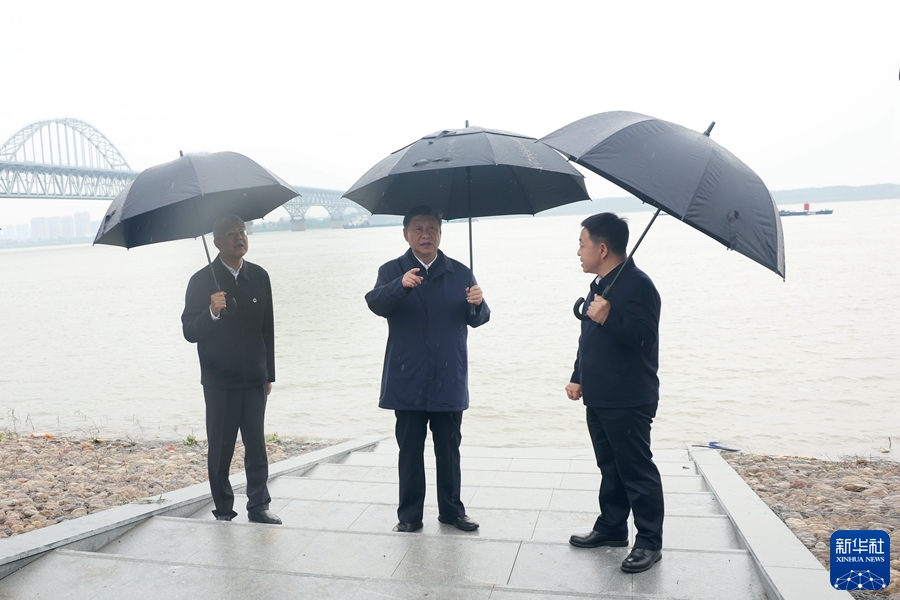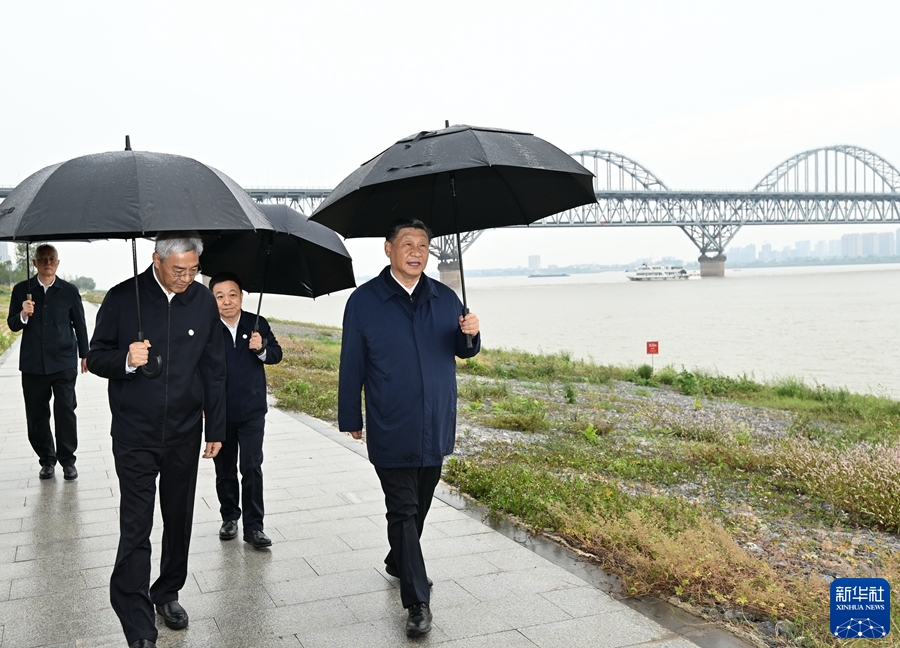 10月10日至13日,中共中央總書記、國家主席、中央軍委主席習近平在江西考察。這是10日下午,習近平在長江國家文化公園九江城區段考察時,冒雨沿江堤步行察看沿岸風貌。