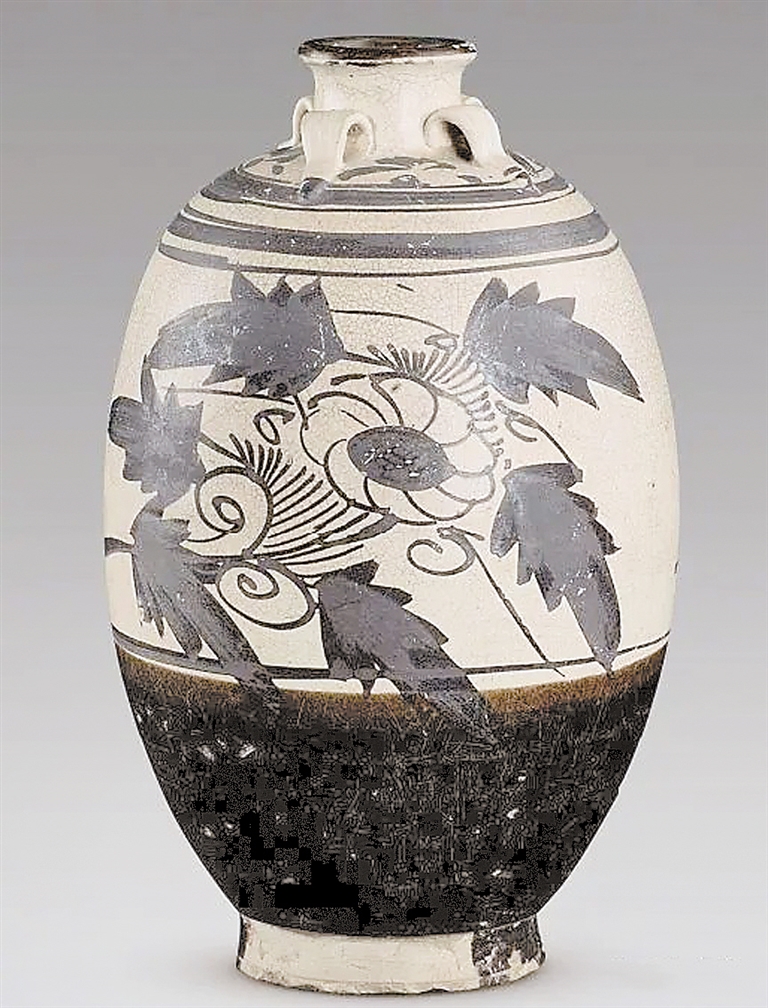 白地黑彩繪畫是磁州窯裝飾技法當中最為精湛的種類,黑白對比鮮明,視覺反差強烈,圖案十分醒目。這件元代磁州窯白釉黑彩折枝菊紋四系瓶,線條粗獷活潑,圖案簡明有力,對比度鮮明,還有一點現代抽象藝術的感覺,是一件不可多得的瓷器珍品。