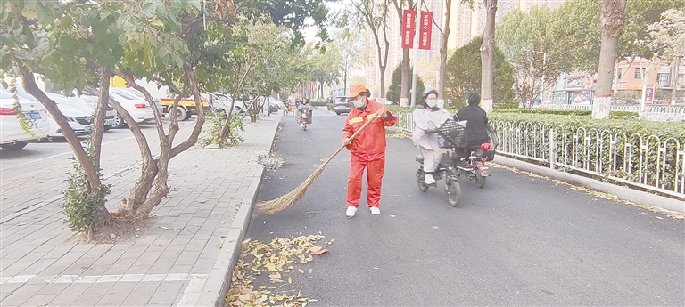 “我們從10月下旬就開始清掃落葉了,遇上降溫天氣,我們剛剛掃完,身后馬上又落下了,工作量是平日的二至三倍?!?0月30日天剛蒙蒙亮,路上車輛行人不是很多,環(huán)衛(wèi)工人崔愛就已來到街頭巷尾,迎著朝霞開始了她一天的勞動,在確保早上出行高峰前給市民創(chuàng)造干凈整潔的出行環(huán)境,6時30分前必須完成晨掃?!昂芏鄷r候,環(huán)衛(wèi)工人為了盡快完成早高峰的第一批清掃任務,早飯都來不及吃。雖然累,但看到干凈整潔的街道,心里特別舒坦?!?/p>