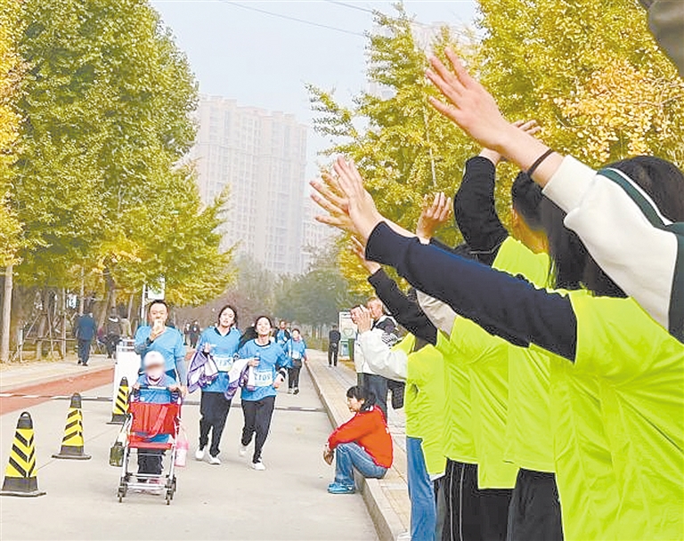 16歲的張博倫和趙佳旭是來自市特教中心的兩名學生,這是兩人第一次跑馬拉松。“能參加此次運動會,我們很開心。比賽讓我們快樂,增進了我們的友誼,也讓我們感受到社會大家庭的關愛和重視,今后有活動我們還會參與。”臉上掛滿汗珠的趙佳旭說,“比賽途中,我們兩個人始終拉著手,老師也緊緊跟著我們,不只是一種陪伴,更是一種動力。”“這兩個孩子,一個是低視力,一個是全盲。這次比賽,他們特別積極,做了很多準備。”不斷給他們溫暖和鼓勵的老師申燦說:“希望通過運動會讓孩子們從運動中感受快樂,學習互幫互助,增強他們面對困難的自信心,將來更好地融入社會。”