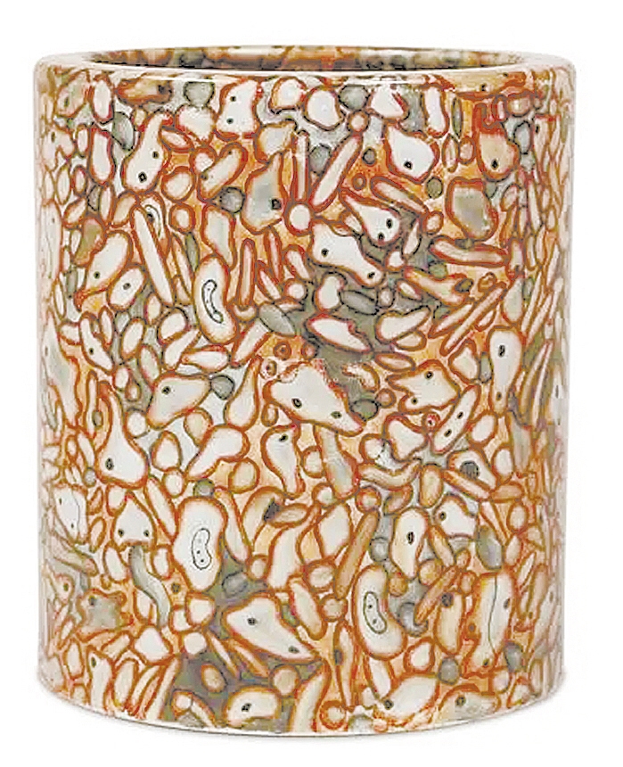 這件筆筒口底相若,筒形腹,圈足,里外均施仿石釉。清乾隆時期,仿制各種工藝品類的像生瓷制作頗盛,幾近無所不仿。仿石紋釉瓷器是在燒制好的白瓷胎上用近似于石質的彩釉勾繪出石頭的紋理,入窯二次高溫燒制而成。這件筆筒仿制效果逼真,玉石質感極強,仿石更勝石。