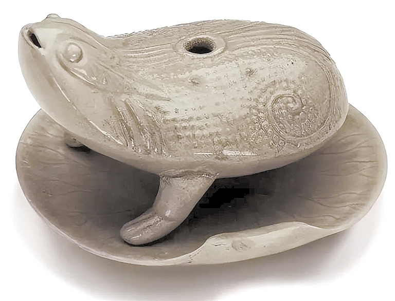 中國人習慣把筆、墨、紙、硯合稱為文房四寶。硯滴是文房常備的用具,與文房四寶有關。這件北宋青瓷蟾蜍硯滴收藏于浙江省慈溪市博物館,長10厘米,高約7厘米,只見一片蓮葉形青瓷盤上站著一只昂首張口的蟾蜍,它雙目圓睜,背部隆起。它的背部有5條弧渦線和小圓點做裝飾,充滿韻律感。蟾蜍似乎略向后蹲,好像隨時會一躍而起的樣子,顯得靈動可愛。它的背部有一個小孔,這是古代硯滴的一個特征。顧名思義,硯滴是一種滴水入硯以供磨墨的盛水器。