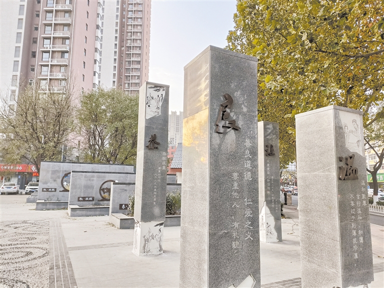 12月8日,在東風路與陽光大街交叉口東南角,中央峰景游園改造提升項目施工現場,市執法局園林綠化中心的工人們正在抓緊施工樹下坐凳。游園面積約4500平方米,大致分為南中東三個區域,南側以中老年鍛煉活動區域為主,東側多為兒童活動區域,中間部分則成為中華傳統文化展示區。區別于市區其他游園,中央峰景游園場地中間兩側分立6面景觀墻和10根景觀柱,把“德、善、誠、和、志、學、勤、儉”“春夏秋冬”等內容以圖文并茂的形式,進行了生動展現。另外還穿插數十幅如一鼓作氣、守株待兔、胸有成竹、對牛彈琴等成語旋轉拼圖,以及孔融讓梨、大禹治水等傳統民間故事。