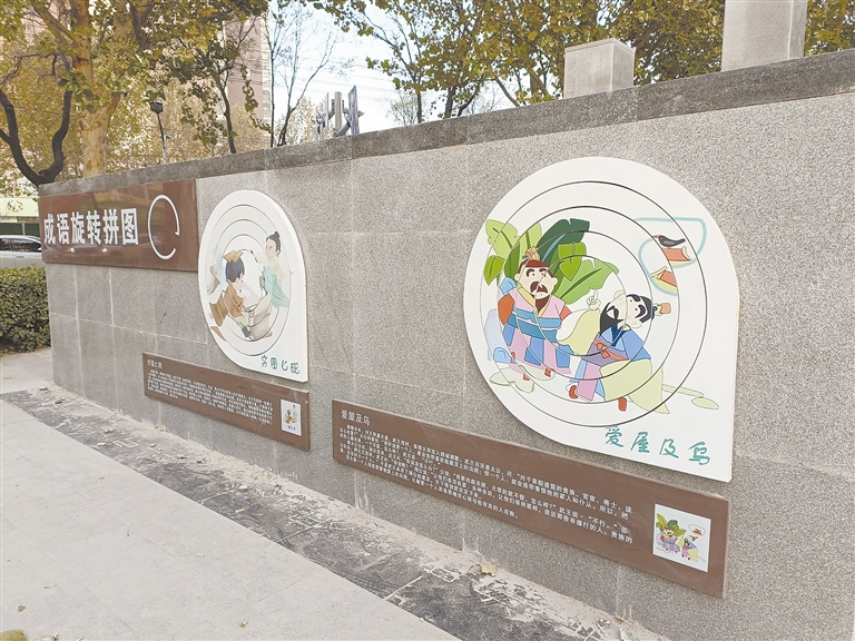 景觀墻后穿插數十幅成語旋轉拼圖。