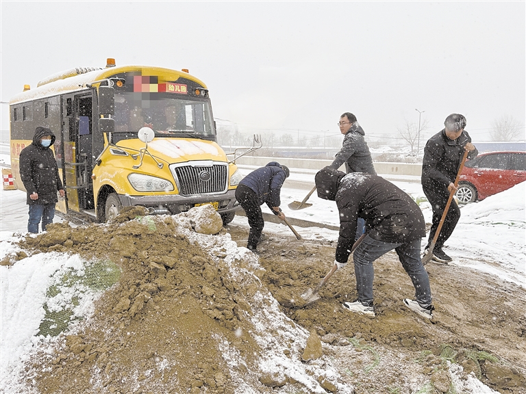 保定晚報(bào)訊(記者耿靜 通訊員趙夢(mèng)晴)“快!拿鐵鍬把下面的積雪和渣土挖一挖!”這是發(fā)生在東二環(huán)主干路上的一幕。近日,市政維護(hù)中心巡視人員在冰雪天,解救了一輛因側(cè)滑被困積雪中的校車。
