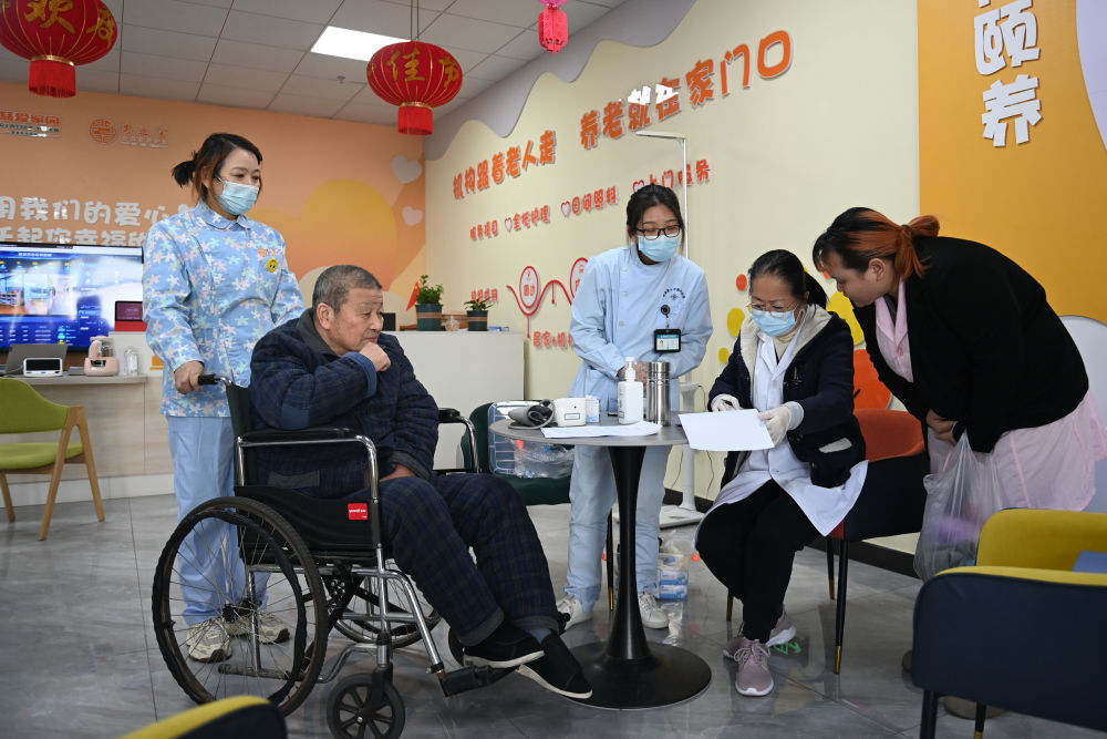 在浙江省慈溪市白沙路街道居家養老服務中心,81歲老人吳森泉(左二)在接受免費助浴服務前進行身體狀況檢查(2023年11月19日攝)。新華社記者 黃宗治 攝