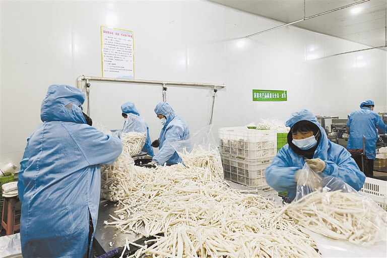 “采摘下來的鮮菇先要運到冷庫預冷,降溫到3攝氏度再送到凈菜車間進行包裝。”企業負責人張利華一邊介紹,一邊帶記者來到凈菜加工車間。