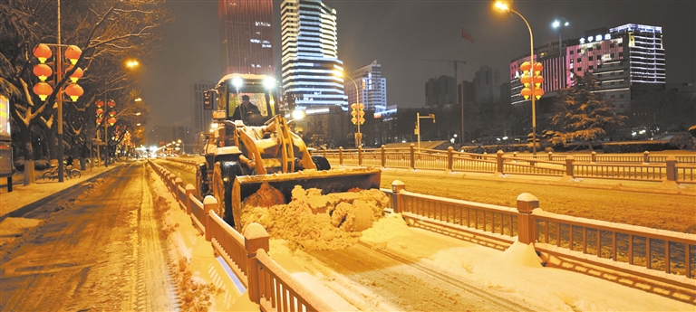 2月20日一早,各區(qū)、各環(huán)衛(wèi)作業(yè)單位清掃路面,路面見白后,環(huán)衛(wèi)人員迅速對轄區(qū)各主次干道和重點(diǎn)區(qū)域,開啟不間斷清雪模式,并針對坡道、彎道、橋梁等易滑路段,以及公廁、公交站臺(tái)、路口、商圈、學(xué)校、市場等關(guān)鍵區(qū)域,視雪量大小清理路面積雪。11時(shí)許,各區(qū)、各環(huán)衛(wèi)作業(yè)單位啟動(dòng)融雪作業(yè),16時(shí)許,主城區(qū)橋梁完成融雪劑撒布作業(yè),城區(qū)主干道積雪清理作業(yè)也緊鑼密鼓進(jìn)行著。
