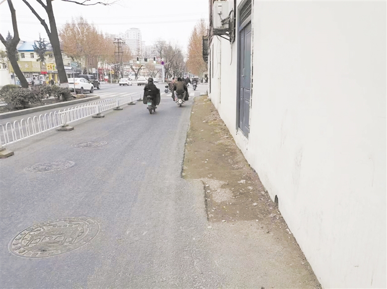 2月28日,就王女士提供的信息,記者來到現場看到,位于陽光北大街與五四中路交口東南側的非機動車道上,有一段路面沒有完全硬化,裸露的土地地面上有些小石子和落葉類的雜物,以及非機動車輛經過后留下的輪胎痕跡。這段裸露的地面長十余米,寬度大約占據非機動車道的三分之一。由于此路段沒有人行道,行人和非機動車主混合在一起行至此處時,紛紛躲開這段裸露的地面,導致可通行的路面顯得更為狹窄。