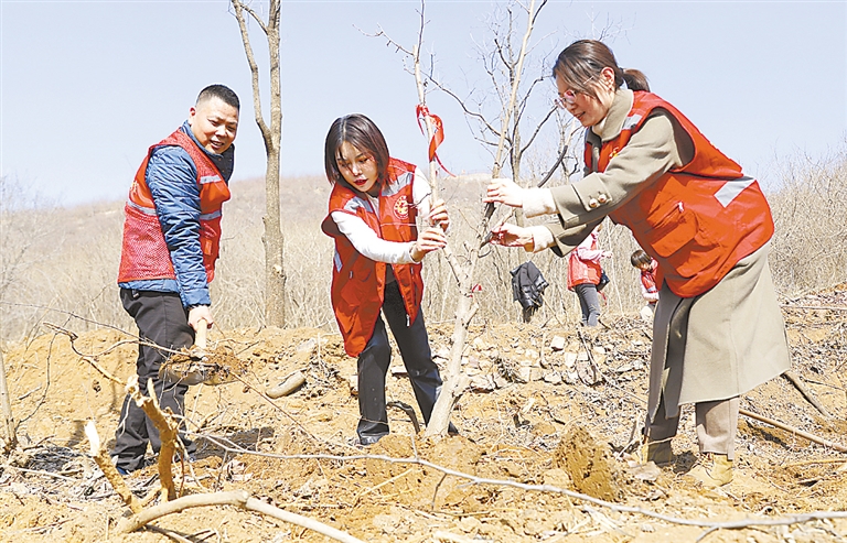 春風送暖,萬物復蘇。3月12日上午,在第46個植樹節來臨之際,保定市愛心敬老協會100余名愛心志愿者來到順平縣鳳凰山開展義務植樹活動,用汗水和熱情踐行“綠水青山就是金山銀山”發展理念,把關注綠化、倡導環保的觀念根植于大家心中。植樹現場,身穿“紅馬甲”的志愿者們精神飽滿,揮鍬鏟土、扶苗踏實、提水澆灌……每個環節都有條不紊,井然有序,呈現出一片其樂融融、熱火朝天的景象。一抹“志愿紅”,一片“生態綠”。在大家的共同努力下,153株滿載希望的榛樹苗昂然挺立,在和煦的春風中萌發盎然生機。