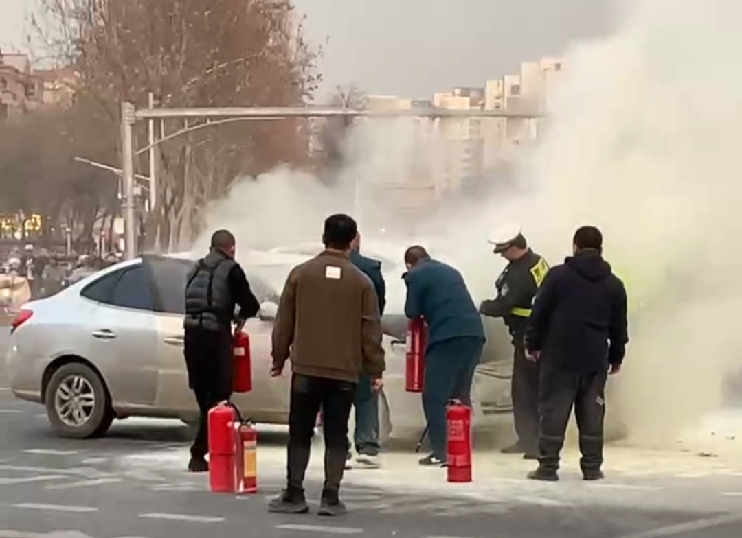 此時正值下班高峰期,途經此路段車輛不少,情況十分危急。楊小博沒有絲毫猶豫,一邊與車內乘客解釋,一邊拎起車內的干粉滅火器,快速沖向起火車輛,對準車輛起火點連續噴射。
