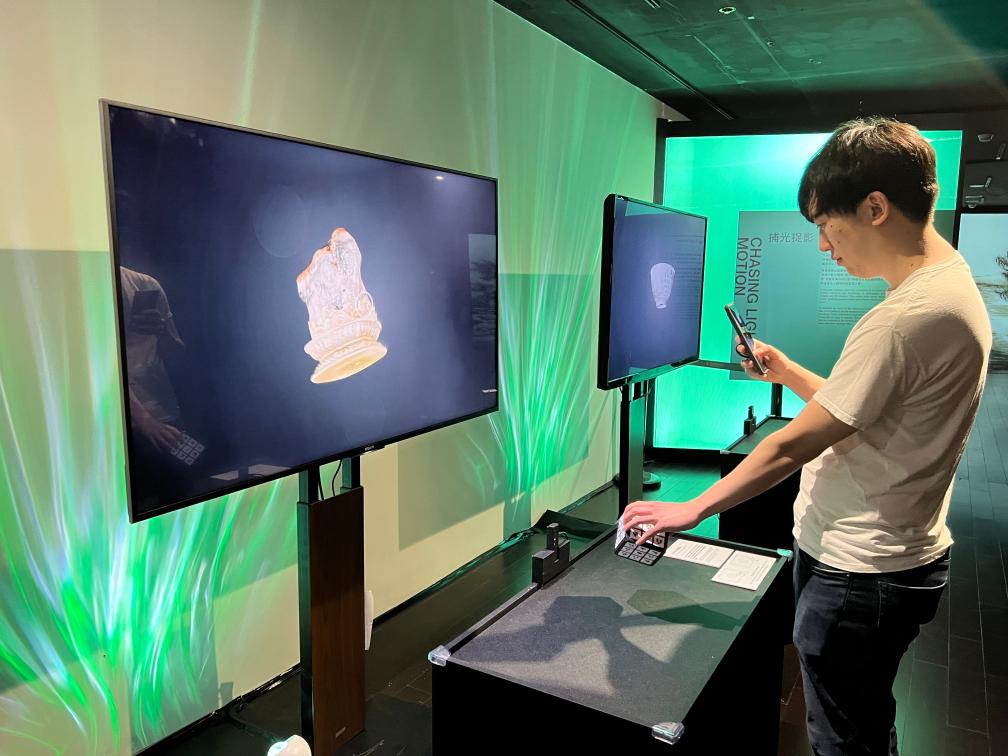 你想象過將翠玉白菜、肉形石拿在手里細細觀賞嗎?在“捕光捉影”單元,借助一個小小的立方體感測器即可實現。通過數字裝置,觀眾手中的立方體化身眼前屏幕中的3D文物模型,隨著手腕轉動,文物360度的樣貌也一一呈現。