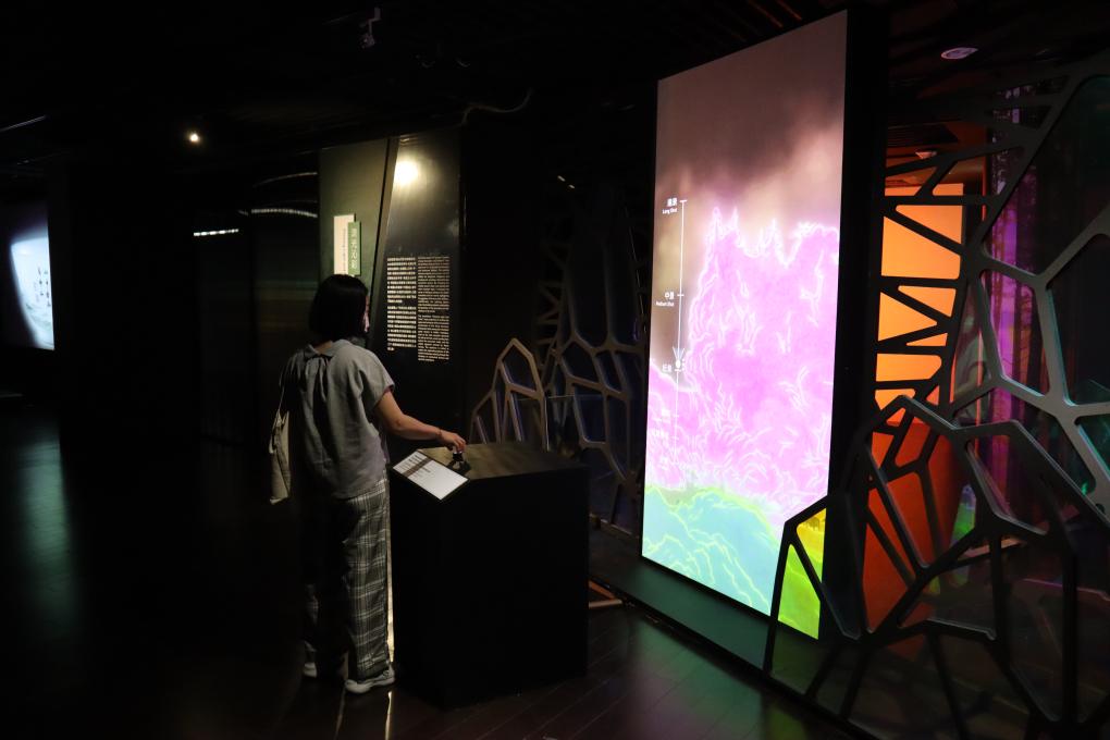 蟲聲、蛙鳴聲、溪水聲……在“小中見大”單元的“聆聽松風”展區,觀眾仿若置身靜謐、清幽的樹林間,耳邊唯有自然之聲流淌。展區靈感取自宋代畫家李唐的《萬壑松風圖》,模擬畫中一條隱蔽山徑,邀人們親身漫步畫作中的山林,感受隨著山勢爬升,周遭環境聲響的不同變化。