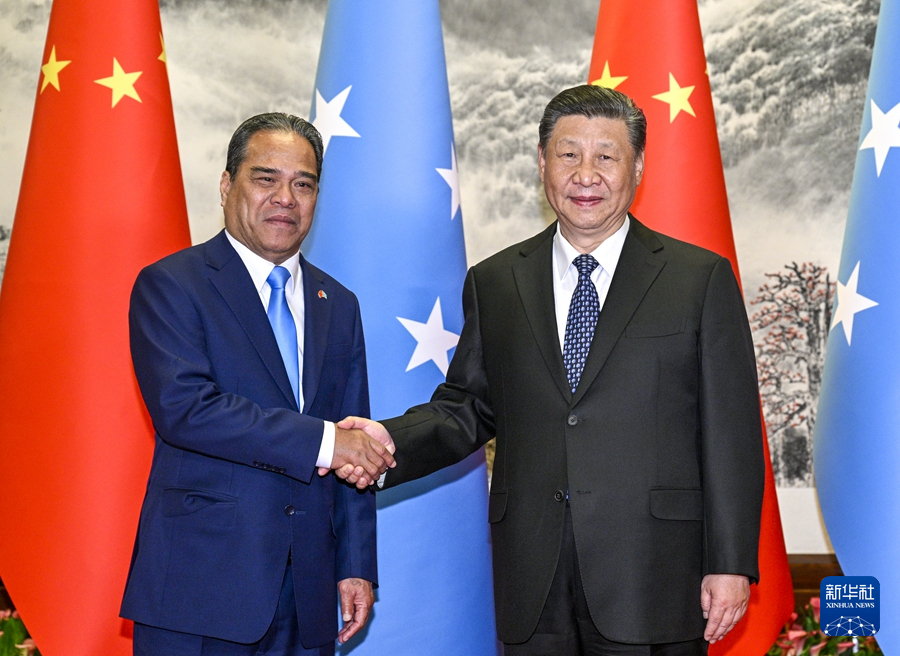 4月9日下午,國家主席習近平在北京人民大會堂同來華進行國事訪問的密克羅尼西亞聯邦總統西米納舉行會談。