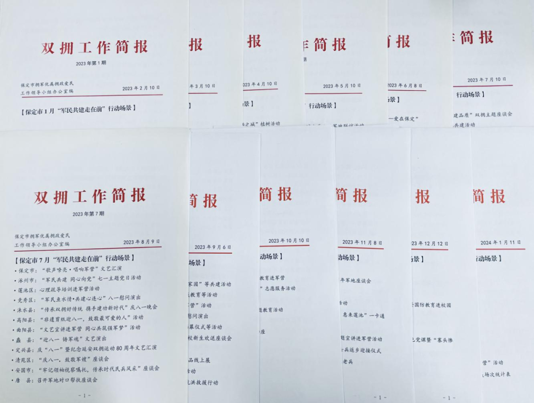 著眼提高軍民共建活動的積極性和創造性,探索打出三套“組合拳”,進一步激發全市愛國擁軍、愛民奉獻的政治熱情。一是培樹標桿。結合軍民共建“五項機制”,大力培樹以深化黨組織建設為基礎的聯學聯建標桿,以行業交流合作為基礎的行業互促標桿,以模范引領為基礎的文化融合標桿,以國防教育為基礎的軍地共育標桿,以定點共建為基礎的村居治理標桿,積極用榜樣的力量溫暖人鼓舞人啟迪人。二是定期點評。推動將軍民共建活動開展情況納入縣(市、區)委書記點評事項,市委主要領導定期講評,并印發《保定市“軍民共建走在前”行動場景》專題簡報,引導各縣(市、區)比學趕超,掀起對標先進找差距、比優勢、強作為、促發展的熱潮。三是宣傳表揚。通過大型文藝演出、專題宣傳片、報刊專欄、新媒體等途徑,廣泛宣傳先進典型,并擇優向國家、省級推薦,引導激勵全社會崇尚先進、爭做先進。2020年以來,共宣傳表揚省級愛國擁軍模范1人,省級愛國擁軍先進單位8個、擁政愛民先進單位3個,省級愛國擁軍先進個人12人、擁政愛民先進個人4人,省級最美雙擁人物2人、最美軍嫂3人。
