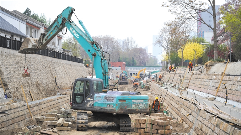 北護城河施工現場,沿著河坡的一側緊臨居民樓。這里的河道上最多時有200多人施工。周濤說,這段河道的施工工地狹小,周邊又是居民集中居住區,附近還有一所學校,同時北河沿的一條街是菜市場。這樣,在施工中便采取晚上進料的方法,盡量避免錘擊,降低機器轟鳴聲,力爭不影響居民生活。