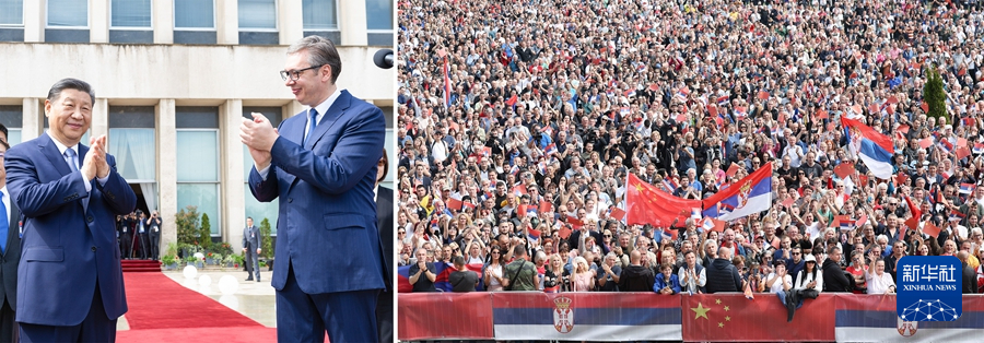 當地時間5月8日上午,國家主席習近平在貝爾格萊德塞爾維亞大廈同塞爾維亞總統武契奇舉行會談。會談前,武契奇陪同習近平來到政府大廈平臺(左圖)。大廈廣場上,一萬五千名塞爾維亞民眾揮舞中塞兩國國旗,對習近平表示最熱烈的歡迎(右圖)。(拼版照片)