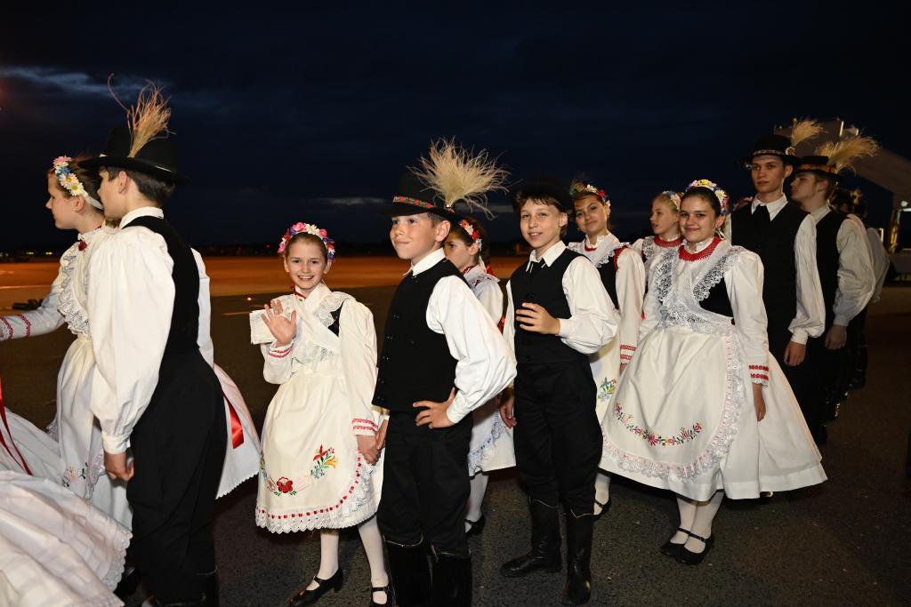 兩名身著民族服裝的匈牙利兒童向習近平主席夫婦獻上面包和鹽,用傳統禮節歡迎最尊貴的客人。匈中雙語學校的學生向習近平夫婦獻花,并用中文說:“歡迎您來到匈牙利”。少年兒童跳起歡快的民族傳統舞蹈查爾達什舞曲,向習近平表達最熱烈的歡迎。