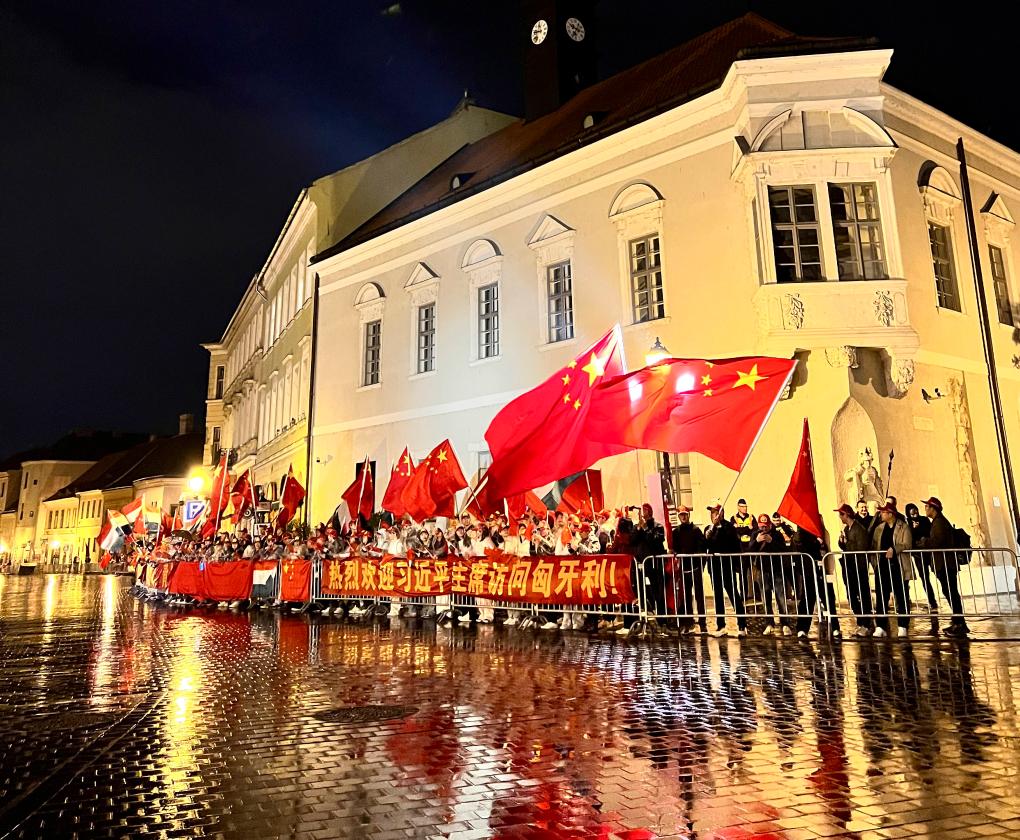 習近平乘車從機場赴下榻飯店途中,數百名當地華人華僑和中國留學生聚集在道路兩旁,揮舞中匈兩國國旗,舉著橫幅,熱烈歡迎習近平主席到訪。