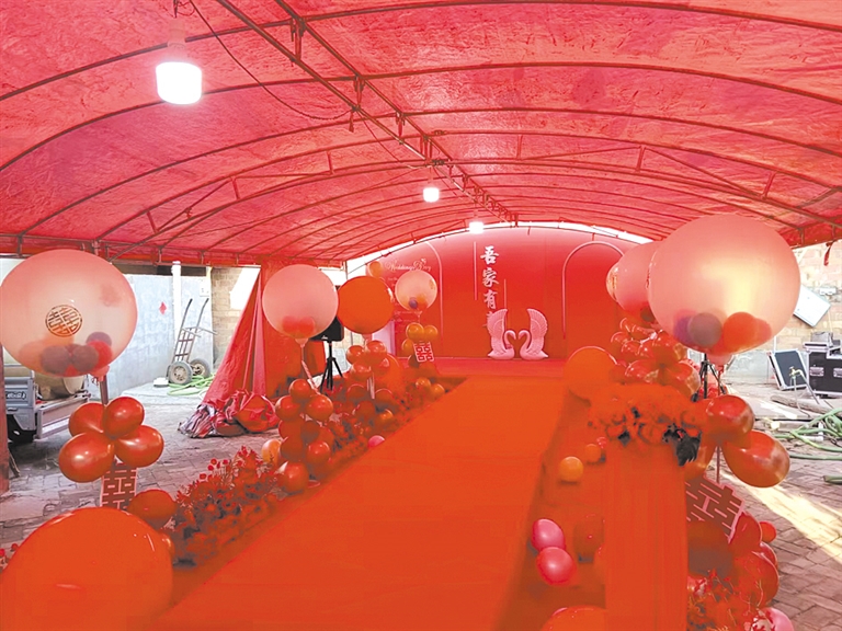 農事間歇,周邊辦喜事的多起來。受邀參加前鄰馬貴勛兒子的婚禮,開了眼:流動餐車供酒席;專業婚慶公司加持——院外彩虹門、囍燈廊,院里搭喜棚、架T型臺,背景墻是大幅吉祥話——吾家有喜,外加“花體英文”祝福詞。新郎官的爺爺說,過去都趕到臘月辦喜事,那是一年地里苦三季兒,難得冬閑、難得手里寬綽“一就兩事”,現在常年都有好日子。