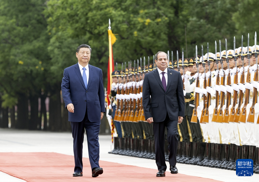 5月29日下午,國家主席習近平在北京人民大會堂同來華出席中國-阿拉伯國家合作論壇第十屆部長級會議開幕式并進行國事訪問的埃及總統塞西舉行會談。這是會談前,習近平在人民大會堂東門外廣場為塞西舉行歡迎儀式。