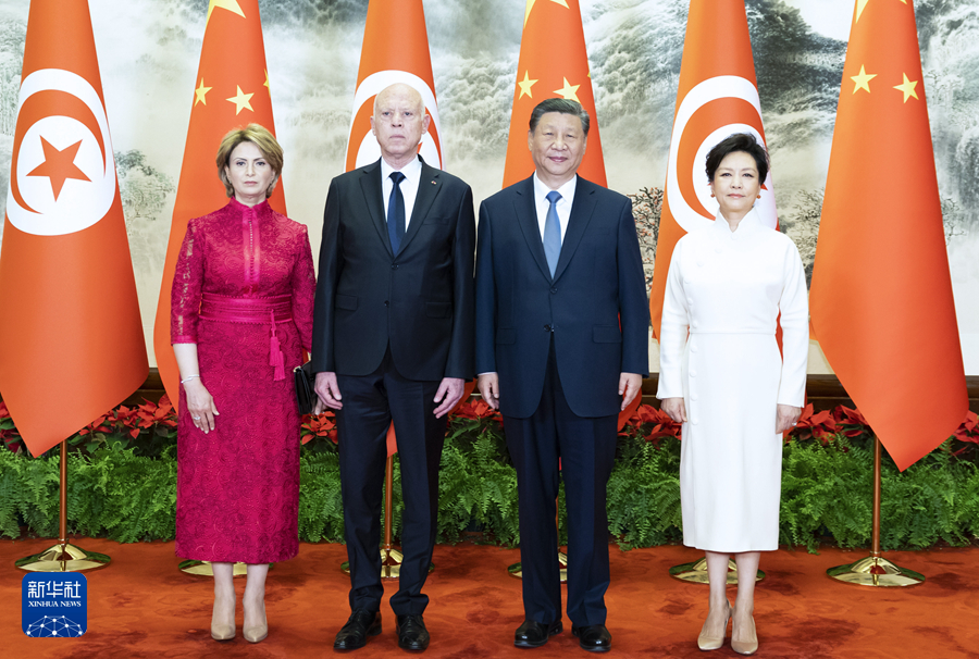 5月31日上午,國家主席習近平在北京人民大會堂同來華國事訪問并出席中國-阿拉伯國家合作論壇第十屆部長級會議開幕式的突尼斯總統賽義德舉行會談。這是會談前,習近平和夫人彭麗媛同賽義德和夫人伊什拉芙合影。