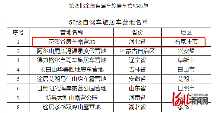 2024年5月30日,全國旅游標準化技術委員會、中國旅游車船協會《關于第四批全國自駕車旅居車營地質量等級評定結果的公示》公示期結束。經自愿申報、省級文化和旅游行政部門審查推薦,根據《全國C級自駕車旅居車營地質量等級認定管理辦法》,全國旅游標準化技術委員會、中國旅游車船協會最終評定后,認定25家單位達到全國5C、4C級自駕車旅居車營地標準。 石家莊花溪谷房車露營位列5C級名單。