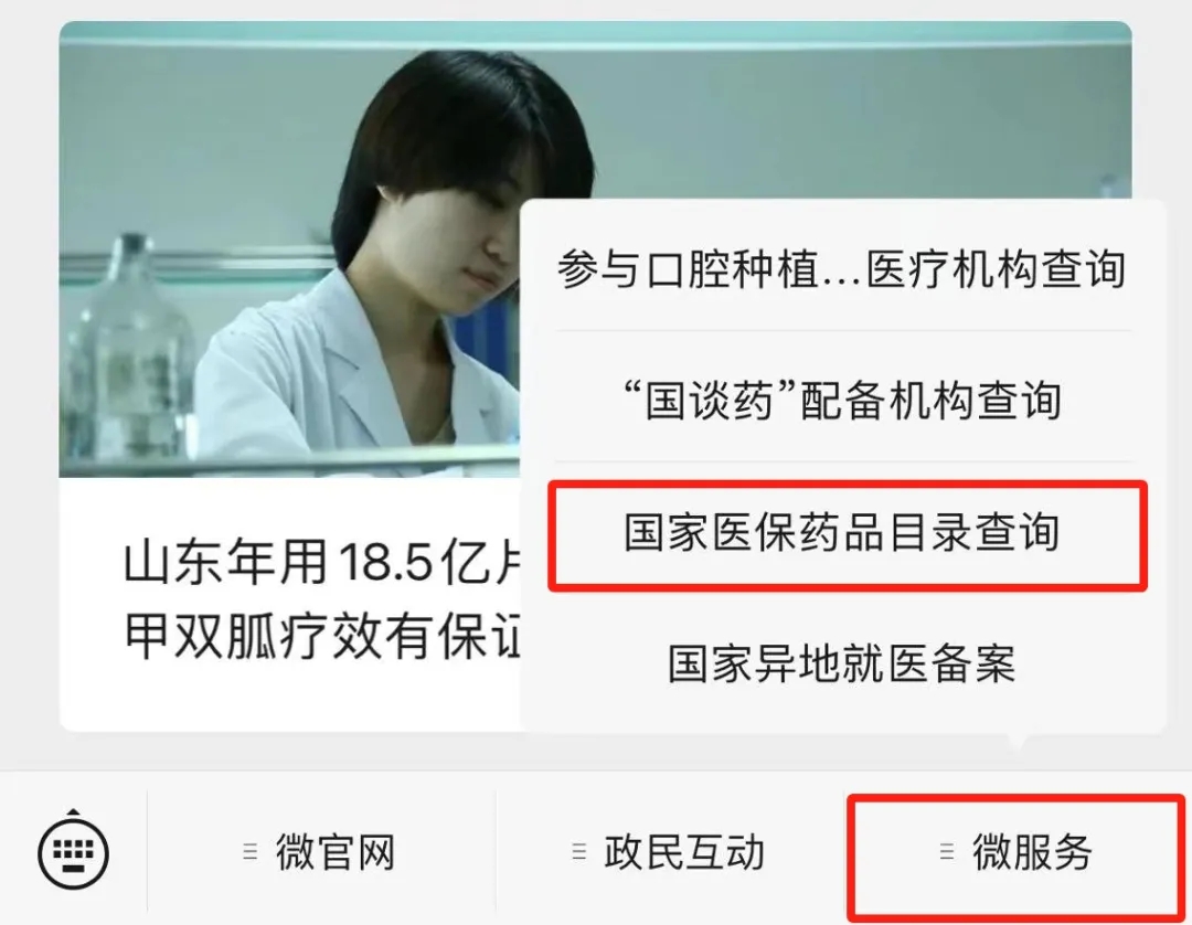 第一步:進入“國家醫保局”微信公眾號,點擊微服務→國家醫保藥品目錄查詢,進入查詢頁面。