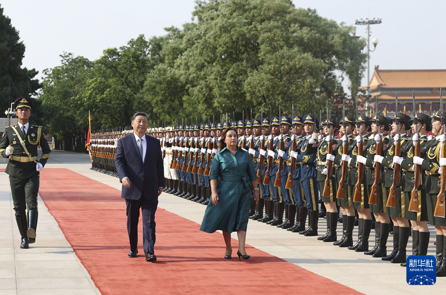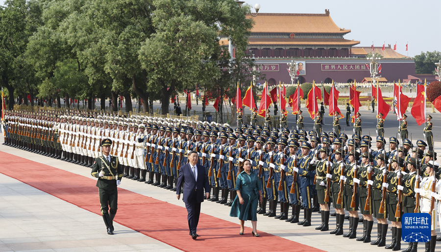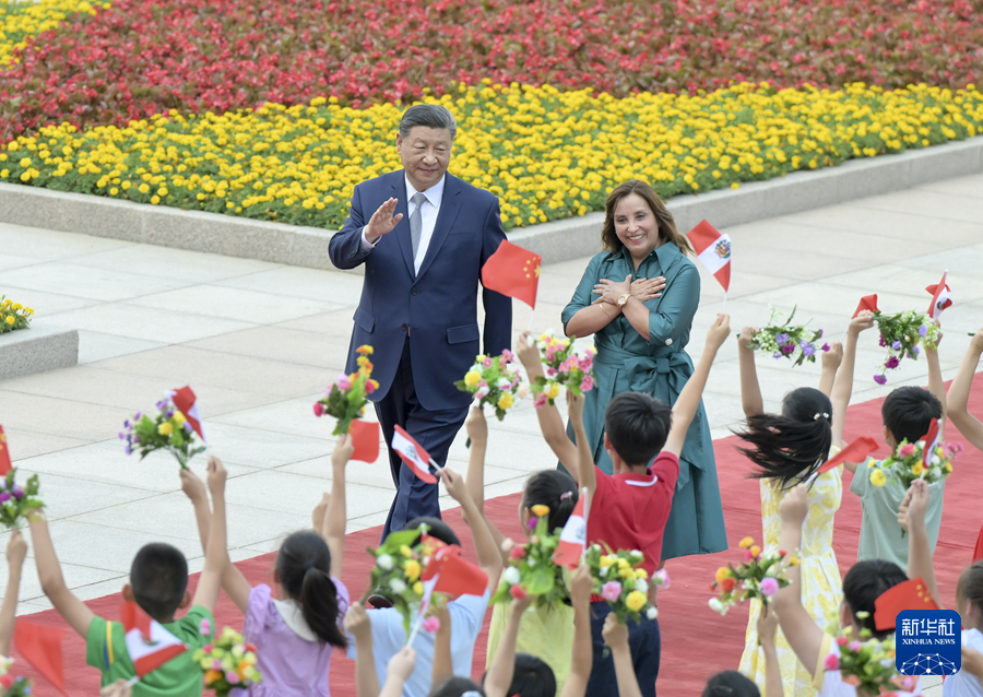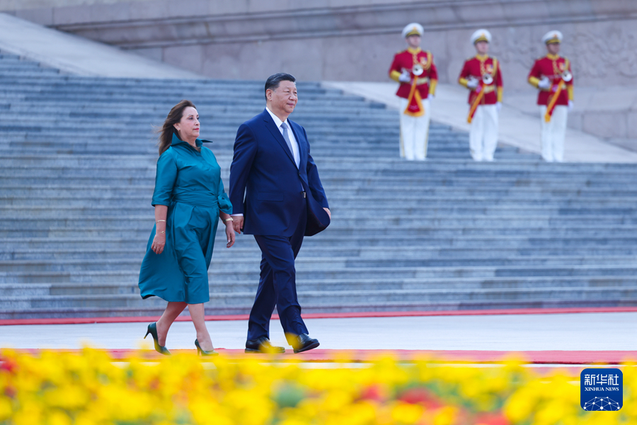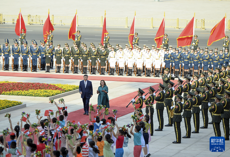 6月28日下午,國家主席習近平在北京人民大會堂同來華進行國事訪問的秘魯總統博魯阿爾特舉行會談。這是會談前,習近平在人民大會堂東門外廣場為博魯阿爾特舉行歡迎儀式。