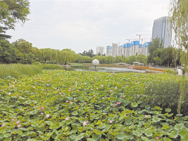 春有百花夏有荷。在競秀公園展區內,滿眼青翠欲滴的碧葉與或含苞待放或激情綻放的朵朵荷花,在微風中搖曳,讓人們充分感受到“接天蓮葉無窮碧”的夏日清涼和“映日荷花別樣紅”的盛夏美景。