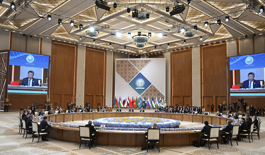 當(dāng)?shù)貢r(shí)間7月4日上午,國(guó)家主席習(xí)近平在阿斯塔納獨(dú)立宮出席上海合作組織成員國(guó)元首理事會(huì)第二十四次會(huì)議。