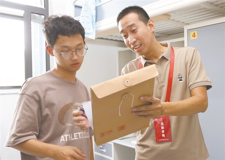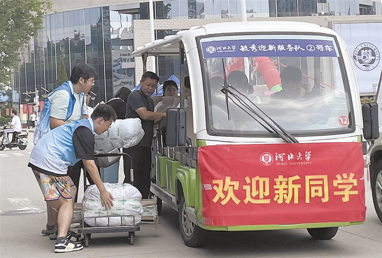 總咨詢臺設置在校門口,有老師和學生志愿者正在解答新生和家長的疑問,并負責將其指引到擺渡車停靠點。擺渡車每十分鐘一趟,負責運送行李并接引學生和家長前往宿舍。雖然是新生報到第一天,記者卻發現新生信息錄入點并沒有排長隊。河北大學黨委學生工作部思政科科長王博介紹,河北大學在微信公眾號上推出新生線上預報到功能,學生可以提前填寫好信息,預約報到時間。把迎新工作做在前面,這樣學校就可以在后臺預測人流量,合理安排報到工作,又能有效緩解周邊交通壓力。