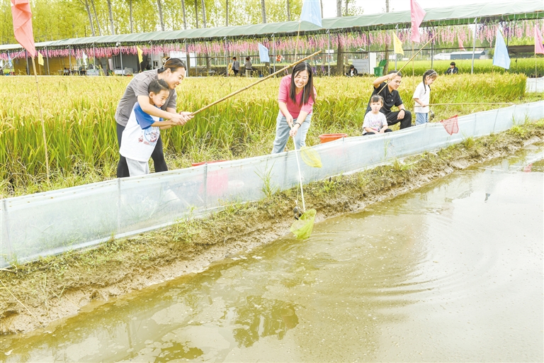 丁蔣莊村養殖稻田蟹的鑫熙源家庭農場,開園第一天就迎來“開門紅”。游客們絡繹不絕,紛紛在水塘邊落座垂釣,不一會兒就輕松釣上來一桶稻田蟹。農場負責人朱景民介紹:“釣上來的螃蟹我們免費加工,方便游客品嘗到第一口鮮,全方位滿足游客吃、游、購、娛的需求。水稻和螃蟹的‘黃金組合’讓我們農場豐產又增收。”