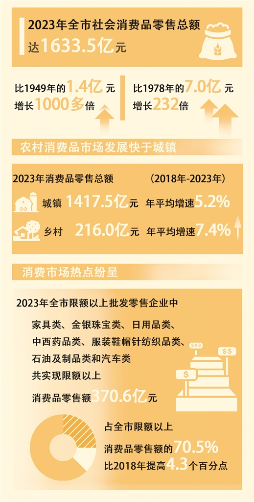 消費品市場快速發展,城鄉結構不斷改善。1949年,全市社會消費品零售總額只有1.4億元,到2023年,全市社會消費品零售總額達1633.5億元,增長一千多倍,比1978年的7.0億元增長232倍,年平均增長15.4%。